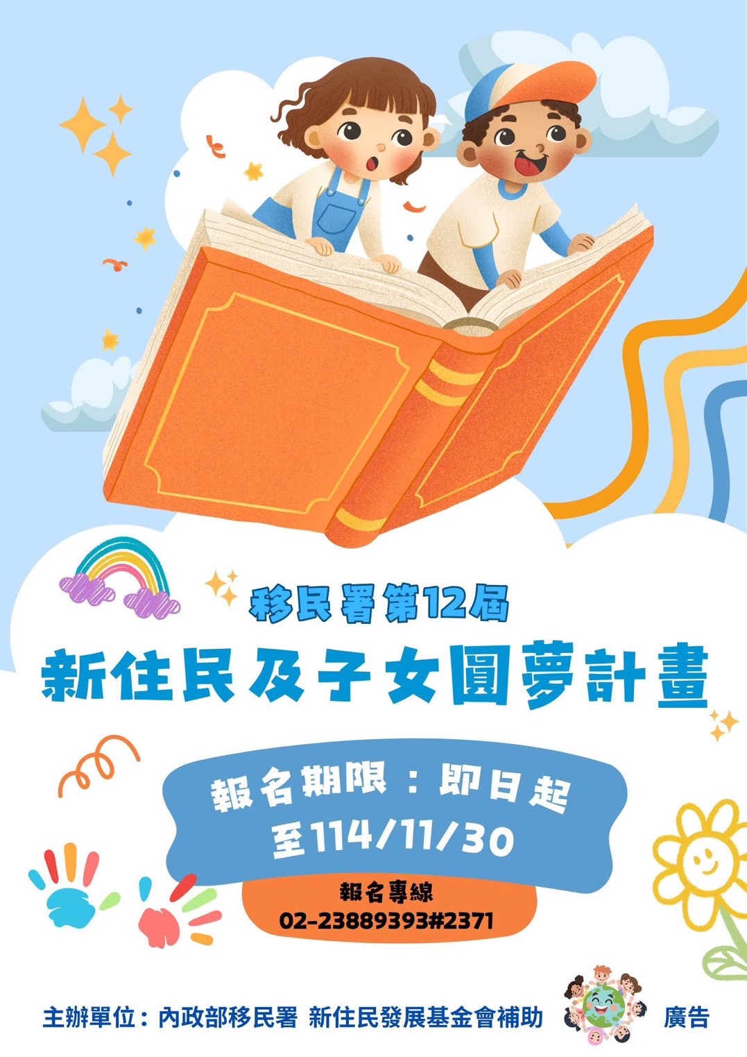 為協助新住民及子女完成夢想,推展多元文化及營造友善社會環境,辦理「第12屆新住民及子女築夢計畫」,報名期間自即日起至114年11月30日止,歡迎符合資格者踴躍報名。