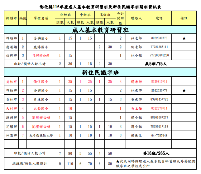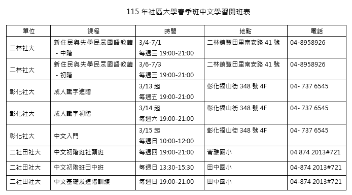 115年中文識字班及社區大學資訊